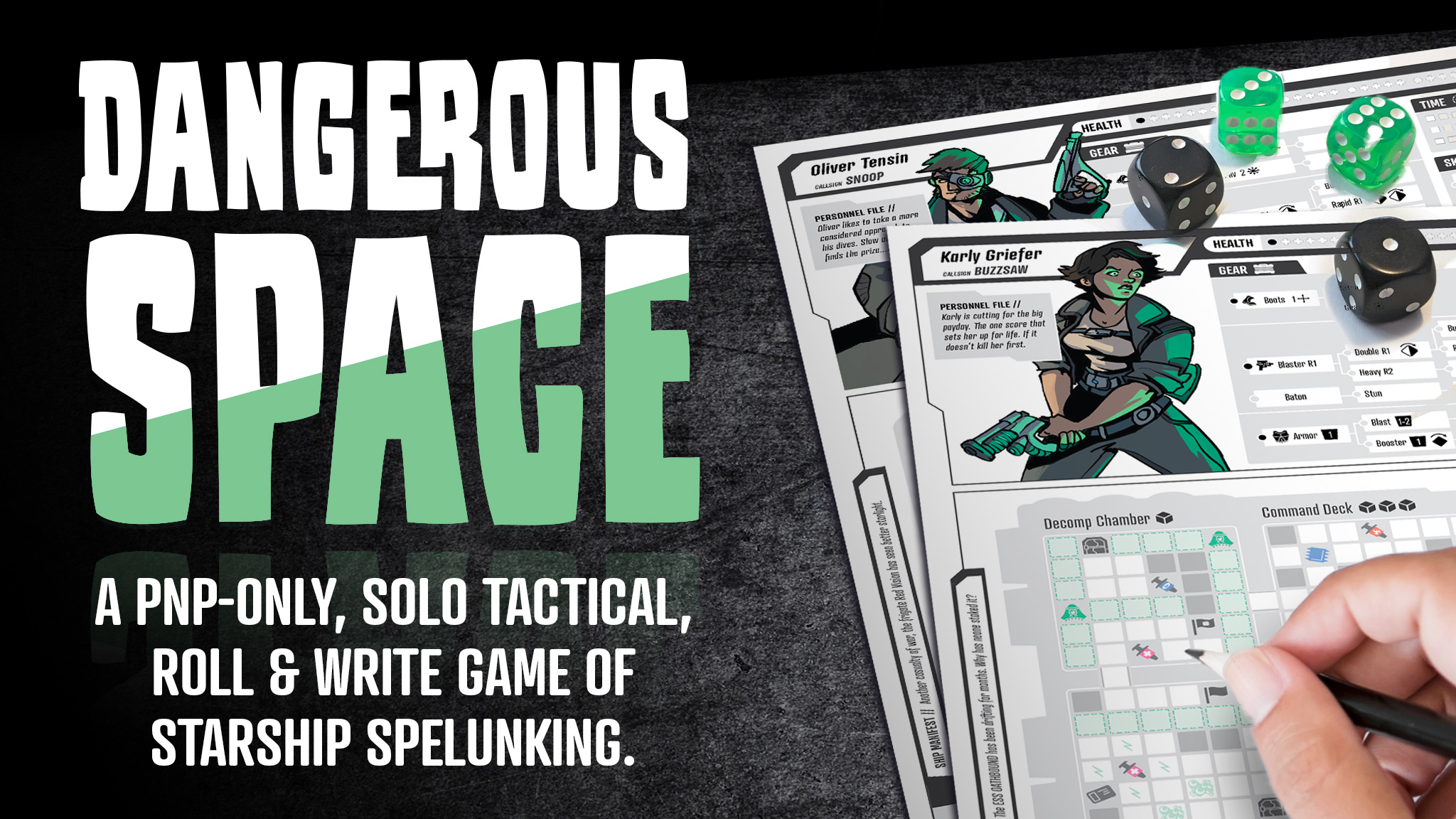 Dangerous Space is a dungeon crawl experience in futuristic starships. This solo, roll & write game has a tactical emphasis on dice management and careful placement.